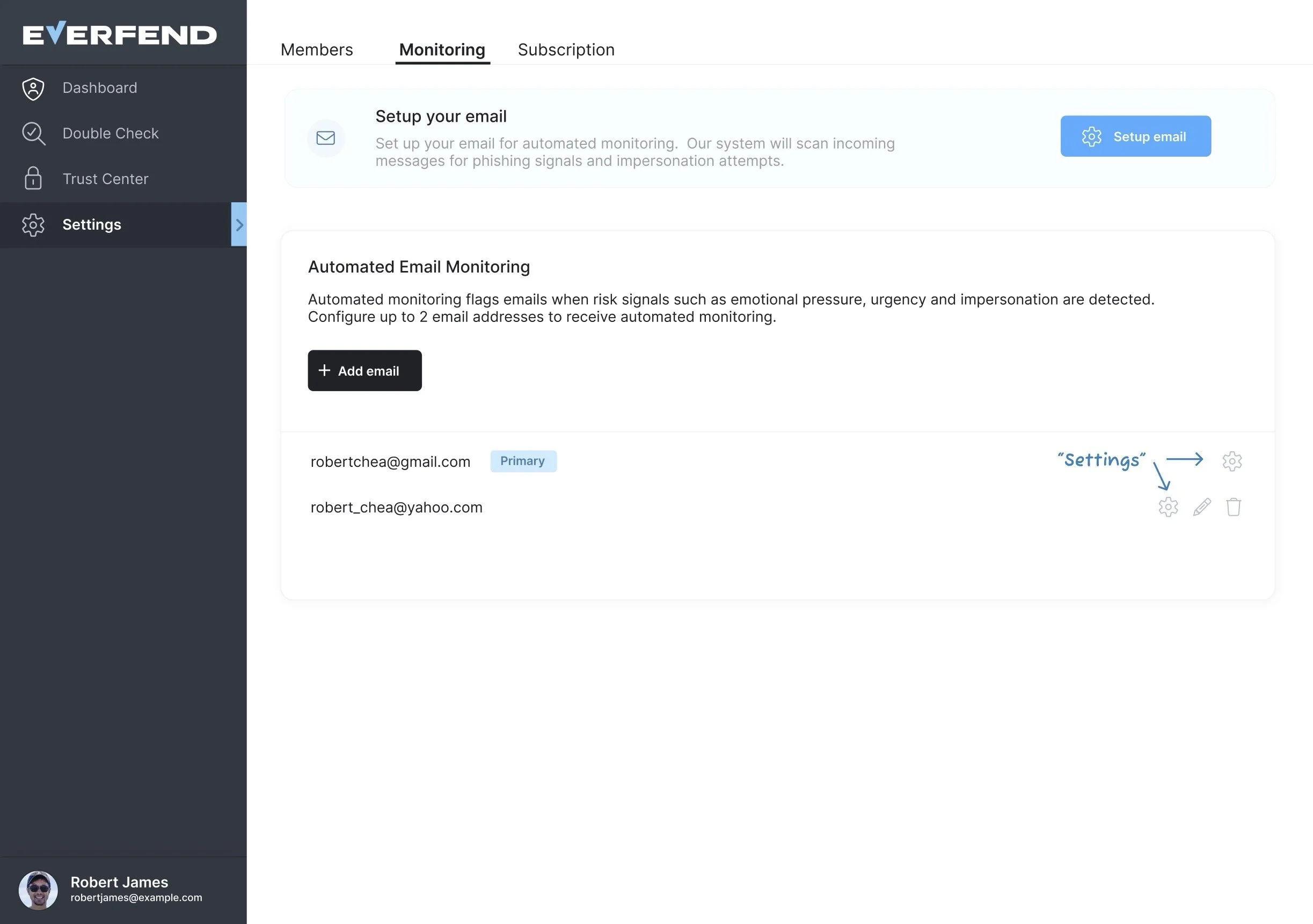 EverFend works by monitoring emails for risk signals such as urgency, emotional pressure, and impersonation. Each paid (subscribed) member may configure up to two email addresses to be monitored.